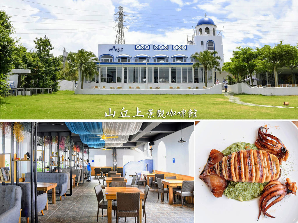 山丘上景觀咖啡館,餐廳外觀是地中海風情的藍白建築,搭配藍天拍起來很美!