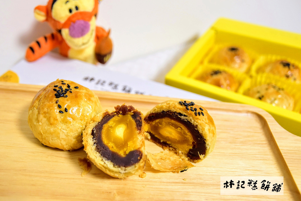 ▼林記蛋黃酥,餅皮裡包著紅豆泥跟一顆完整飽滿的鹹蛋黃,一咬下去外層餅皮非常的酥香,而底層口感更是脆,光是外層餅皮的部分就非常好吃,而內層紅豆泥的口感很綿密,但甜度不高,所以入口比較能感受到的是鹹香的蛋香。