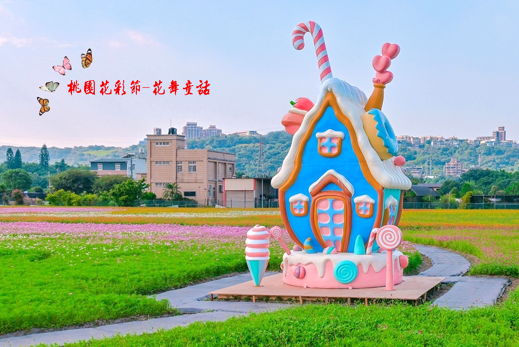 2023桃園花彩節,今年主題為「花舞童話」,整體設計圍繞著夢幻和童趣創作,超過20款的主題圖騰也是歷屆最多,在休耕的農田上,用繽紛的花朵繪出童話世界,加上花田中的夢幻打卡裝置藝術,包括5公尺高的「神奇糖果屋」、蝴蝶仙子,幻境3D彩繪牆等,保證IG美照拍不完。(文引自桃園市政府)
